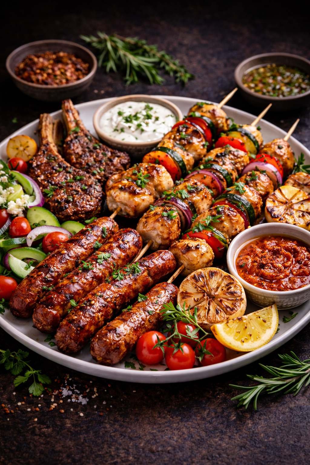 Généreuse assiette de grillades variées composée de côtelettes d’agneau, saucisses grillées et brochettes marinées, accompagnée de légumes frais, citron grillé et sauces maison.