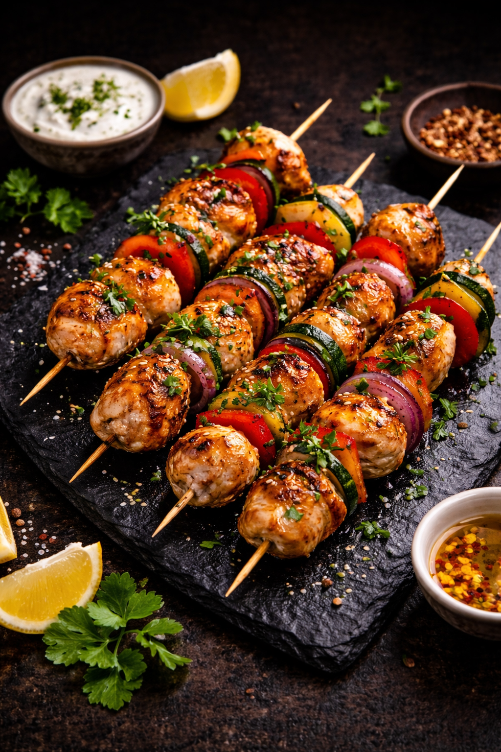 Délicieuses brochettes de poulet mariné, tendres et juteuses, grillées à la perfection et accompagnées de légumes frais (tomates, courgettes, poivrons). Relevées d’herbes aromatiques et d’épices maison, elles offrent une saveur équilibrée et gourmande.