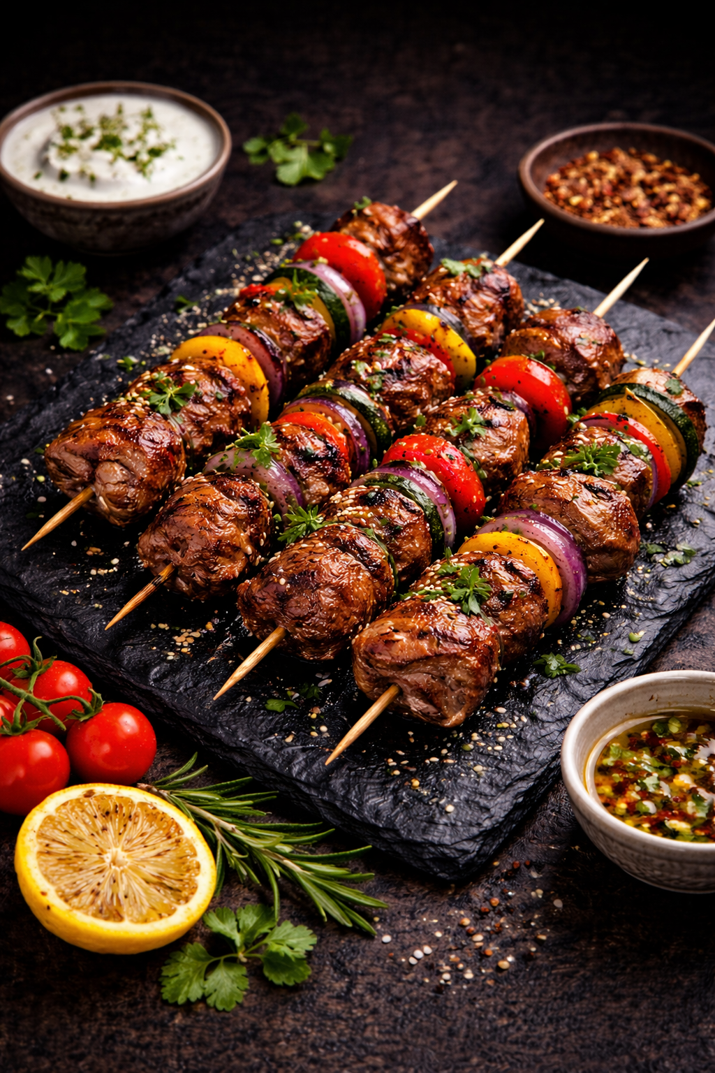 Savoureuses brochettes de viande marinée, grillées au feu pour une cuisson parfaite, accompagnées de légumes frais croquants (poivrons, tomates, oignons). Un plat équilibré et parfumé, idéal pour les amateurs de grillades authentiques.