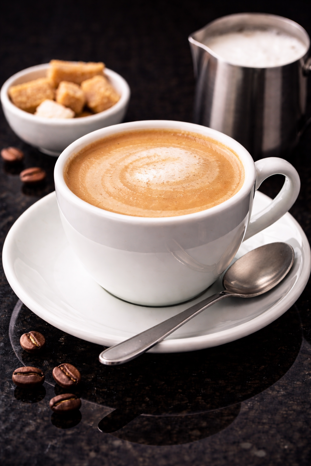 Café adouci au lait chaud, texture veloutée.