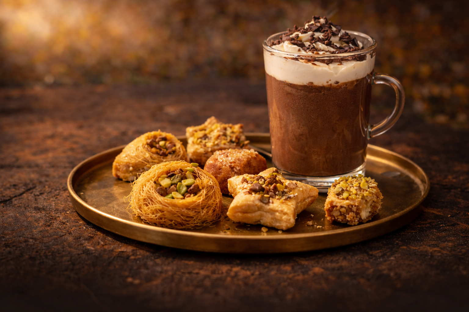 Chocolat chaud onctueux servi avec 3 assortiment de pâtisseries fines.