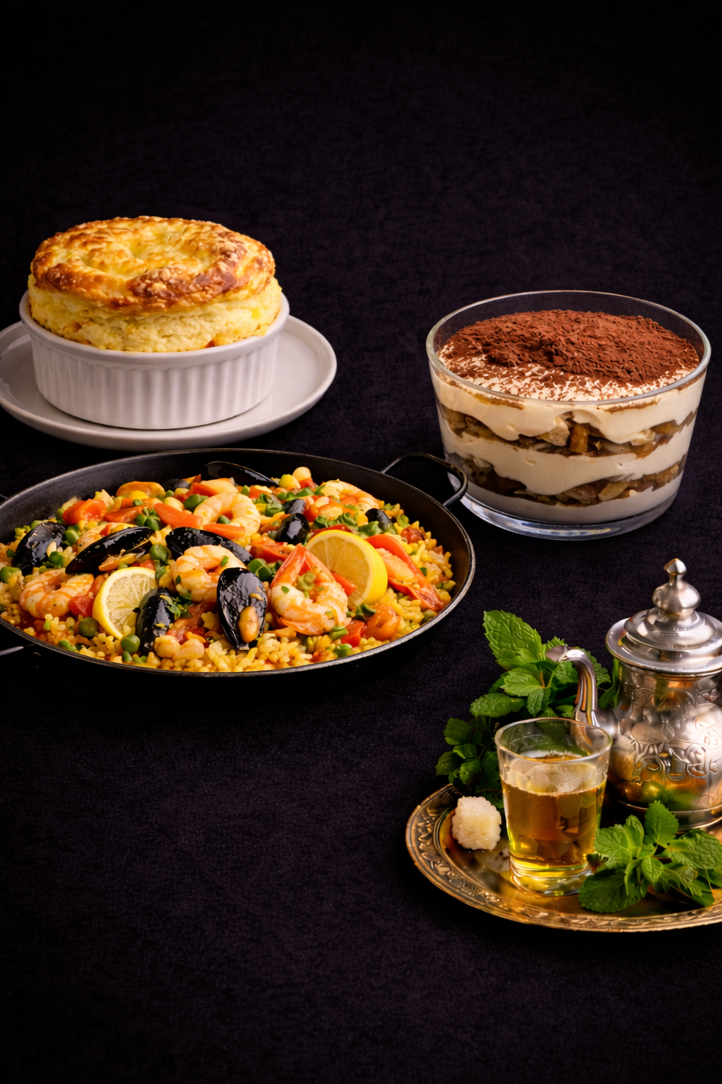 Paella généreuse à partager aux saveurs méditerranéennes, accompagnée d’un soufflé maison, d’un tiramisu onctueux et d’un thé à la menthe traditionnel. Un menu complet, idéal pour un dîner convivial et gourmand à deux.