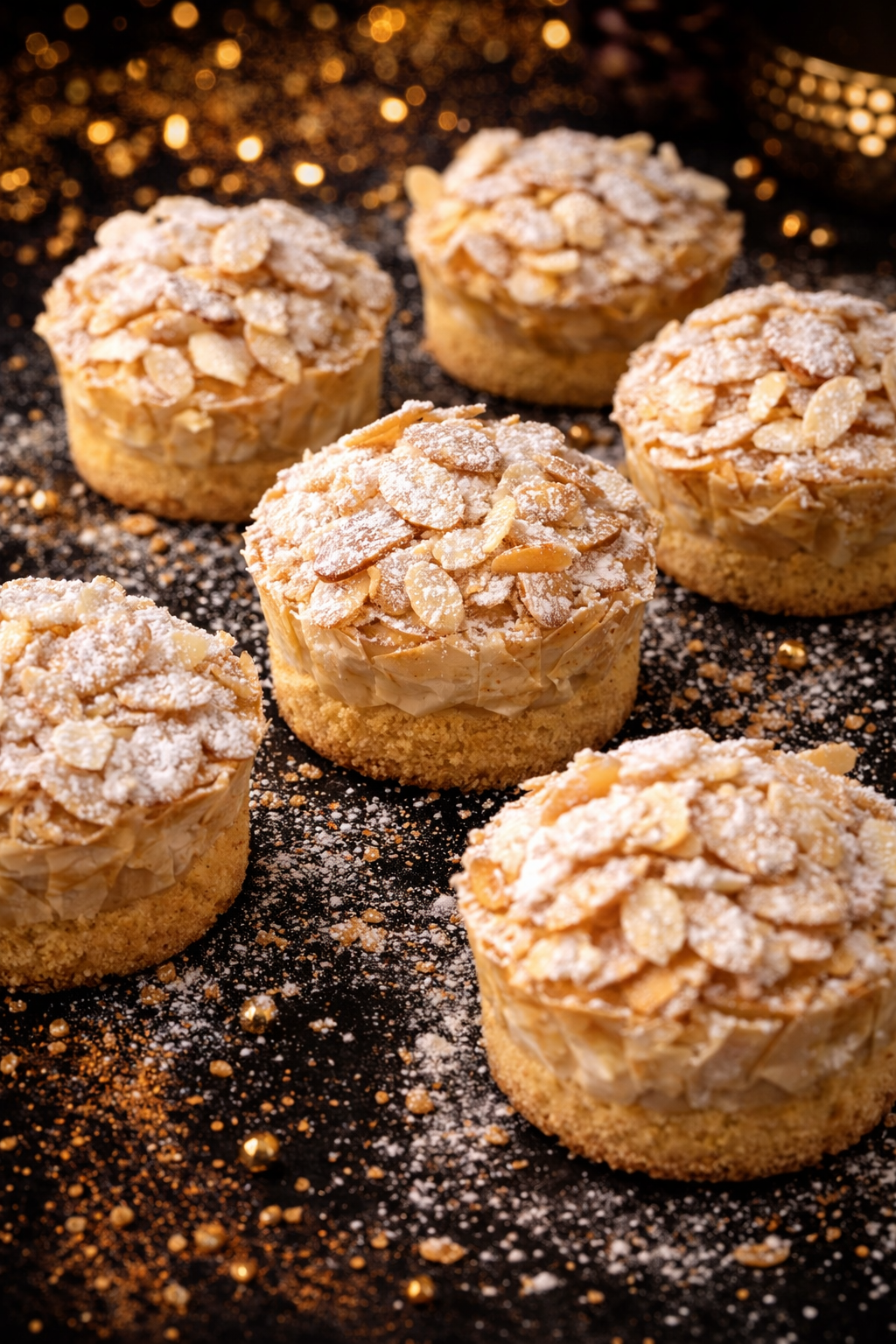 Mini cake fondant, cœur de pâte sablée enveloppé de pâte filo croustillante, délicatement saupoudré d’amandes effilées et d’un voile de sucre glace.